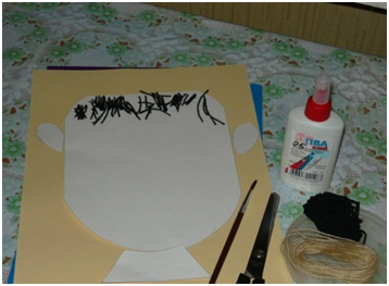 3. Берем шерстяные нитки, можно мулине черного, белого, коричневого или жёлтого цвета, разрезаем на полоски и приклеиваем на «голову».